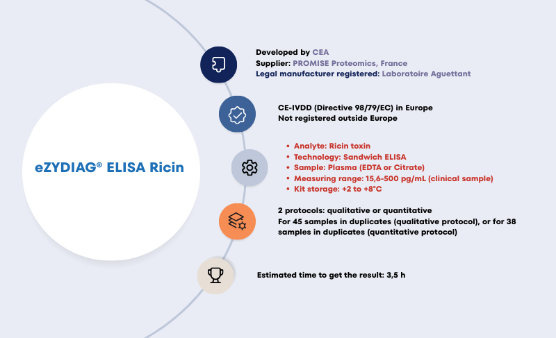 The eZYDIAG® quantitative assays for Ricin toxin and LF toxin from Bacillus anthracis have been developed by CEA (Commissariat à l’Energie Atomique, France). Both kits are based on ELISA (enzyme-linked immunosorbent assay), with specific antibodies developed by CEA.