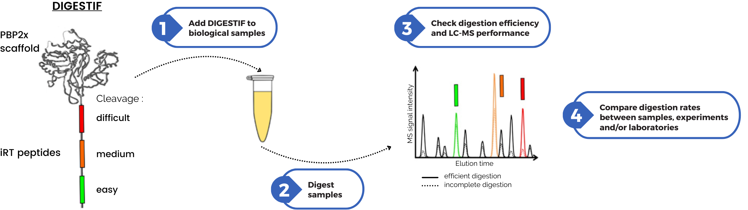 DIGESTIF is a two-in-one quality control reagent used to check digestion quality & efficiency as well as LC-MS performances during bottom-up proteomic experiments.